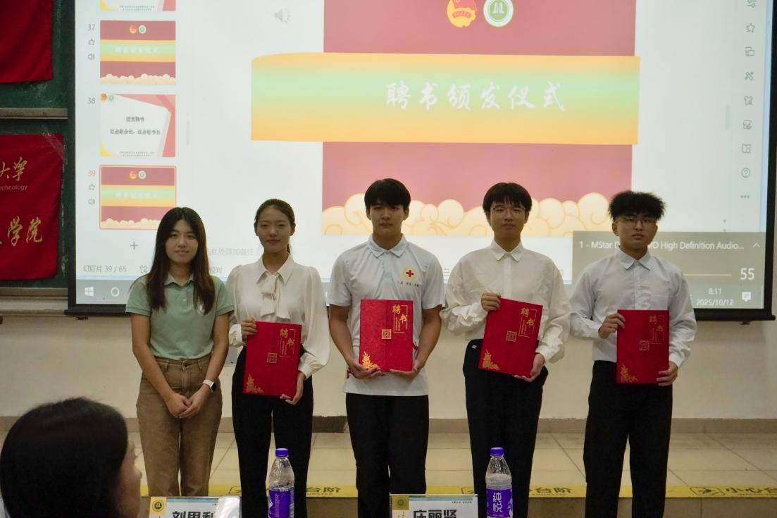 在聘任环节,学院团学组织及红十字会学生干部依次上台接受聘书。老师们勉励大家在新的岗位上履职尽责、积极作为,发挥模范带头作用。