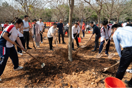 今天,校友代表梁智峰、谢伟锋、彭少辉、张荣华重返校园同时校友也邀请了原学院辅导员、现学校党委统战部副部长林冰花共同参与植树活动,学院党委书记周建强、学院党委副书记陈颂坚等学院教师一同出席活动,与在校学生一起亲手植下新苗,为校园增添一抹新绿