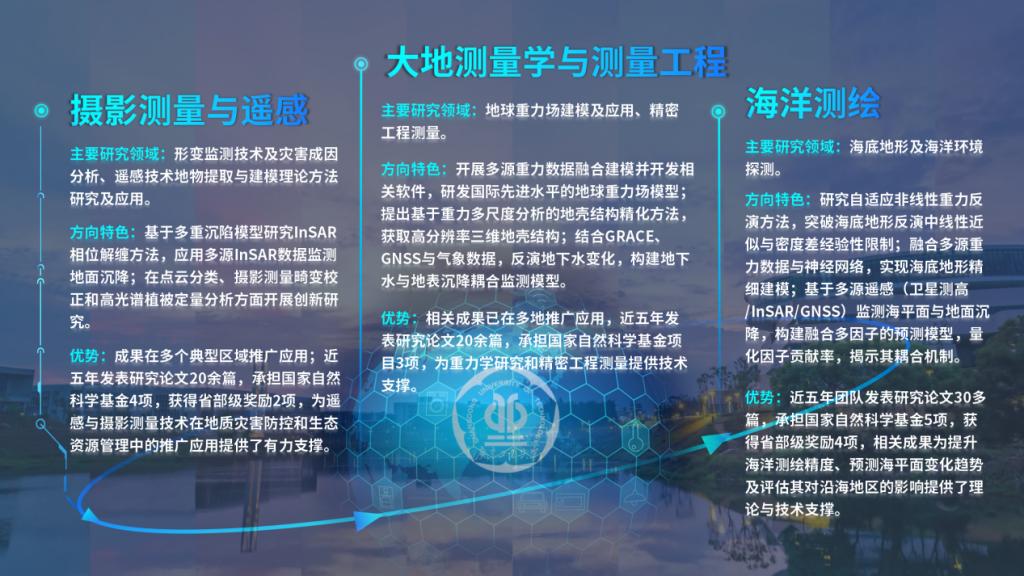 专业以服务大湾区自然资源研究与重大灾害监测与防治为目标,经过多年发展,形成了摄影测量与遥感、大地测量学与测量工程、海洋测绘三个稳定的学科方向。
