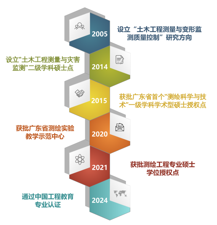 2005年学校在“结构工程”二级学科硕士点下设立了“土木工程测量与变形监测质量控制”研究方向。2014年在“土木工程”一级学科硕士点下设立“土木工程测量与灾害监测”二级学科硕士点。2015年获批广东省首个“测绘科学与技术”一级学科学术型硕士学位授权点。2020年12月获批广东省测绘实验教学示范中心。2021年获批测绘工程专业硕士学位授权点。2024年通过中国工程教育专业认证。