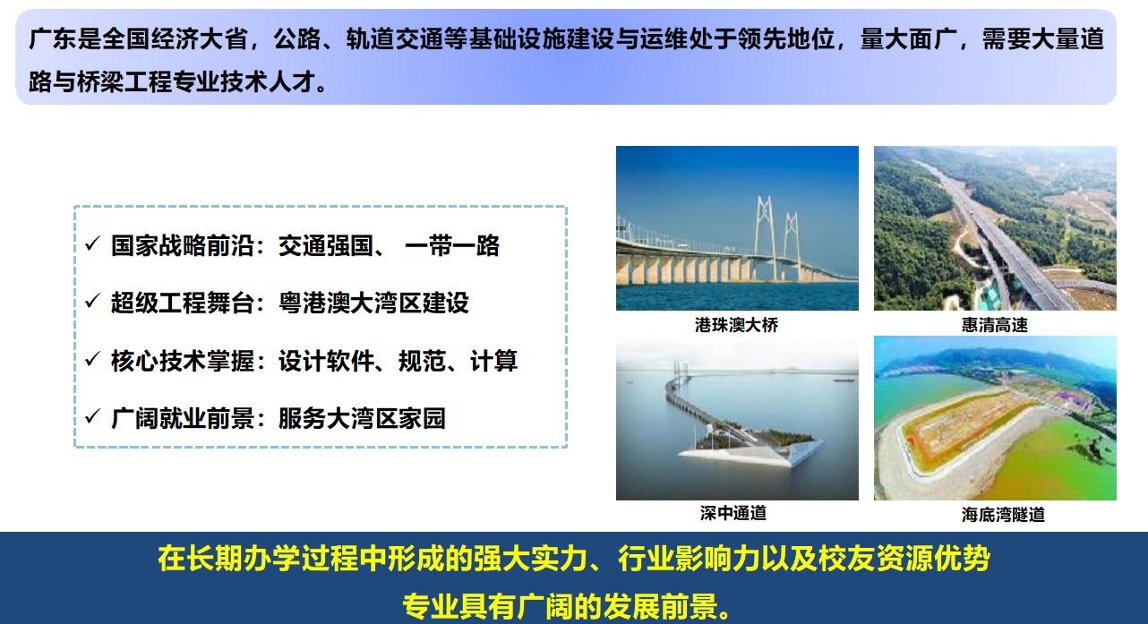 桥梁与隧道工程方向已为国家培养输送了大批优秀人才,他们活跃在工程设计院、科研院所、大型施工企业、政府部门等关键岗位,成为行业的技术骨干和管理精英,在大湾区超级工程、国家重大基础设施建设项目中发挥着重要作用。广工土木人的足迹,遍布祖国建设的壮丽画卷!