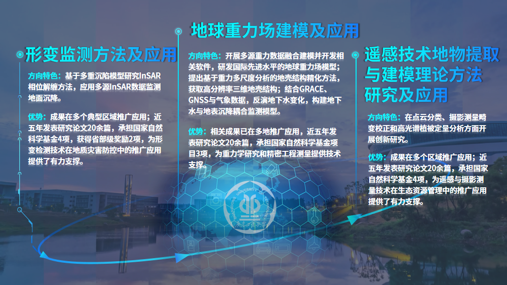 专业以服务大湾区自然资源研究与重大灾害监测与防治为目标,经过多年发展,形成了形变监测方法及应用、地球重力场建模及应用、遥感技术地物提取与建模理论方法研究及应用三个稳定的研究方向,具有鲜明的特色和优势。