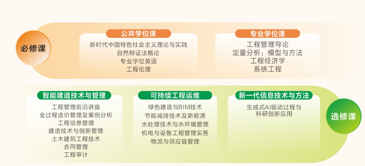 本专业学制3年,最长5年,实行双导师制,贯穿整个培养过程。为达到高层次工程管理人才培养目标,课程体系设置基于工程管理核心知识平台、工程专业方向技术知识平台和专业方向实践教学平台搭建,包括公共学位课、专业学位课(工程管理核心知识平台课程,不低于8 学分)、专业方向选修课(工程专业方向技术知识平台,不低于 9 学分)、公共选修课(不低于1学分)及必修环节等五部分。其中必修环节包括开题报告、中期检查、专业实践(专业方向实践教学平台)。